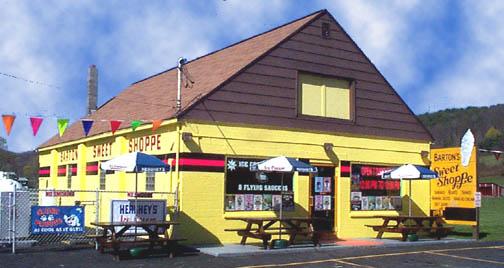 BARTON'S SWEET SHOPPE SERVING HERSHEY'S PREMIUM ICE CREAM 32 FLAVORS HARD / 3 SOFT SHAKES • FLOATS •SUNDAES • BANANNA SPLITS SLUSH PUPPIES • HALF GALLONS OPEN 7 DAYS A WEEK noon to 10 pm